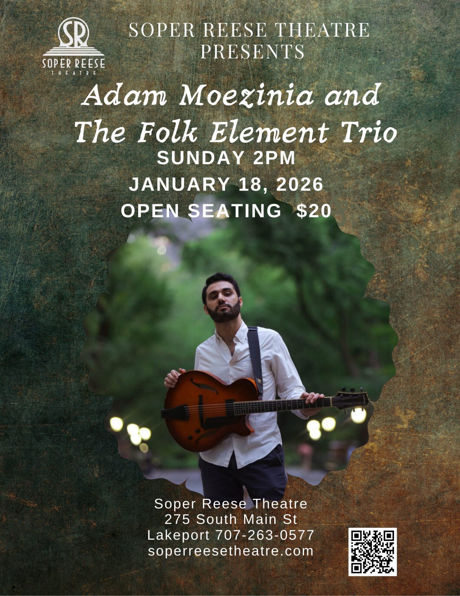Adam’s group, “The Folk Element Trio” is rooted in the tradition of jazz but reaches beyond to incorporate different styles of folk music from around the world including West Africa, the Caribbean, The UK and Appalachia. They released their debut album in April of 2021 to rave reviews and have since been performing all around the country. They will be performing at The Soper Reese Theatre as part of a 5 week west coast tour. Joining Adam will be Emiliano Lasansky on bass and Marcello Carelli on drums.”