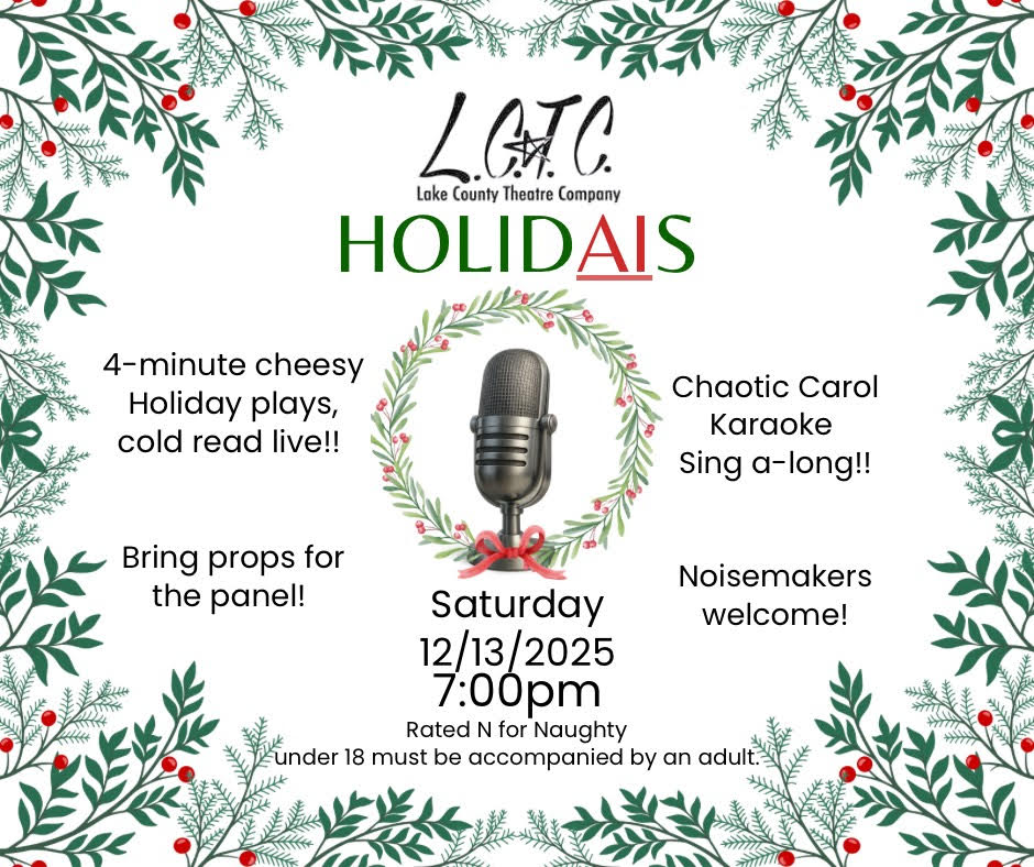 “HolidAIs is a witty, winter-themed show from the Lake County Theatre Company where AI-generated holiday scripts come to life through live improv, comedy, and audience participation. It’s part variety show, part chaos, and all in good fun. A one-of-a-kind community event pairing laughter, creativity, and a touch of holiday spirit.”
